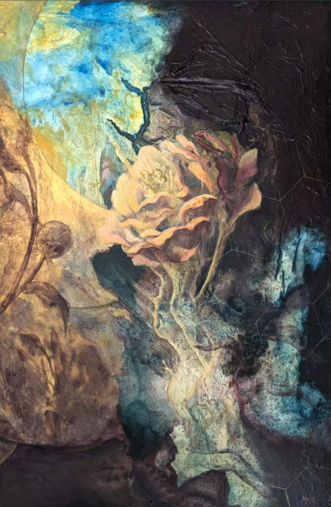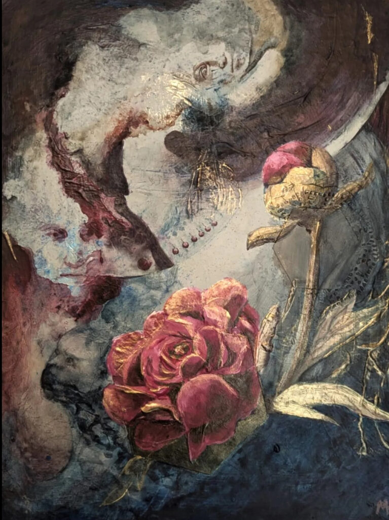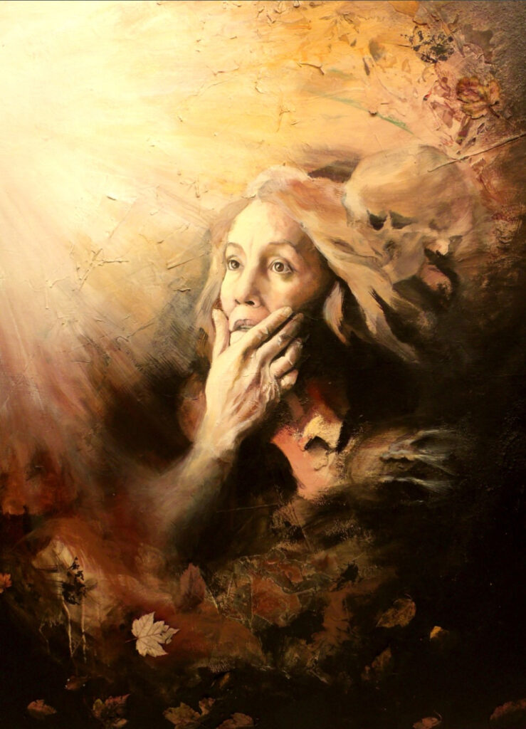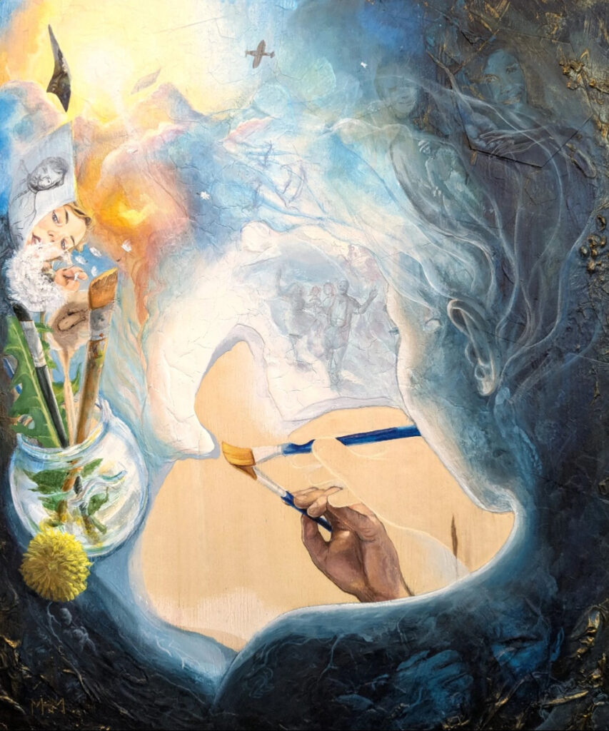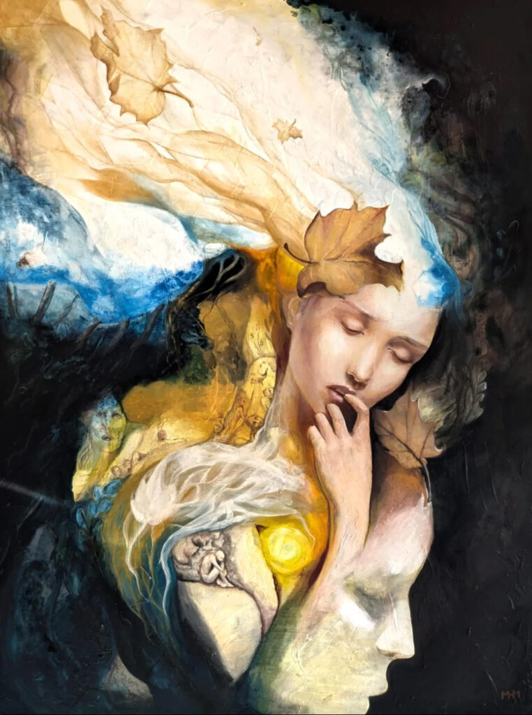 Craftmanship, elegance, and metacognition is what defines Marie Homolkova-Michalek’s Art. Her work is a combination of inspirations of Alfons Mucha’s depiction of natural beauty and grace, the dramatic light famous of Caravaggio, the raw horror-like creativity of Hieronymus Bosch, and the introspective written work of the British philosopher, James Allen’s, “As a Man Thinketh”. This was the core inspiration for “The Gardener” exhibit in 2025. Much of Marie’s best work is an attempt at capturing the inner thought processes as one deals with trauma, hardship, love, and the ultimate pursuit of enlightenment and peace.